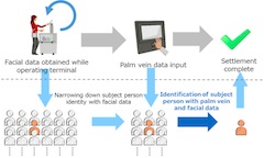KAWASAKI, Japan, Oct 4, 2018 - (JCN Newswire) - Fujitsu Laboratories Ltd. today announces development of a non-contact, integrated biometric authentication technology that can identify a person using only their palm vein and facial data. Developed jointly with Fujitsu R&D Center Co., Ltd., the technology represents a step closer to the creation of a cashless society. To enable biometric authentication that would confirm a person's identity at brick-and-mortar stores or for admissions at event venues, streamlining searches of a huge volume of registered biometric data - on a scale of one million users -- had required narrowing down the subject person by using cards or other forms of data. Fujitsu has now developed technology that enables a smooth payment procedure in which users only need to hold their hands over a terminal, while the identity of the subject individual is narrowed down by facial image effortlessly captured using the payment terminal and camera set in close proximity. This technology enables wallet-free payments without the need to show IDs, paving the way to a more convenient cashless society. Details on this technology will be announced at the International Conference on Image Processing 2018 (ICIP 2018), held in Athens, Greece, from October 7. It will also be exhibited at CEATEC JAPAN 2018, which will be held at Makuhari Messe from October 16.