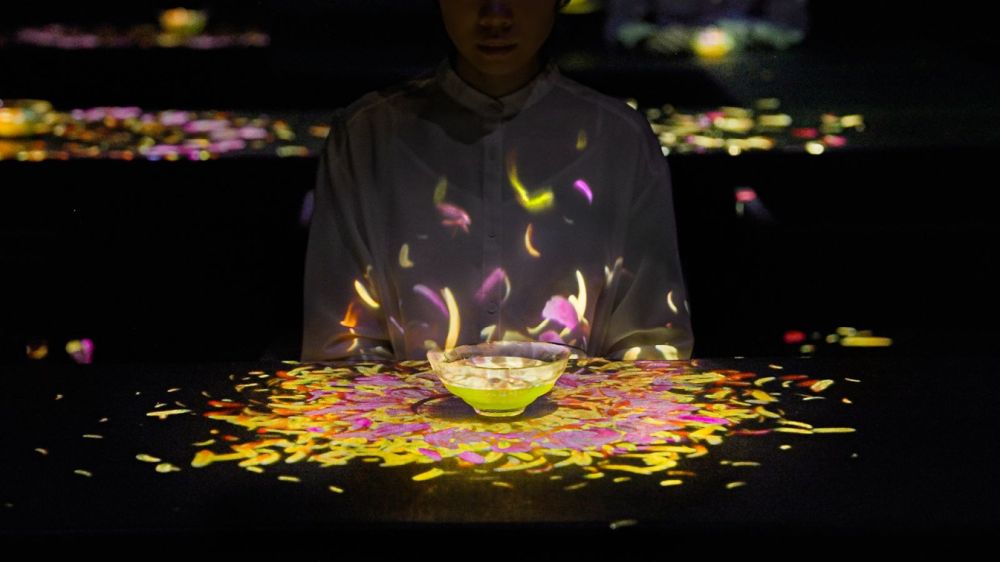 When a cup of tea is made, flowers bloom inside the teacup. When the teacup is lifted, the flower petals scatter and spread outside of the cup. Flowers bloom infinitely as long as there is tea. Drink in the infinitely expanding world. This artwork is born with the tea and vanishes once the tea is drunk. teamLab, Flowers Bloom in an Infinite Universe inside a Teacup © teamLab