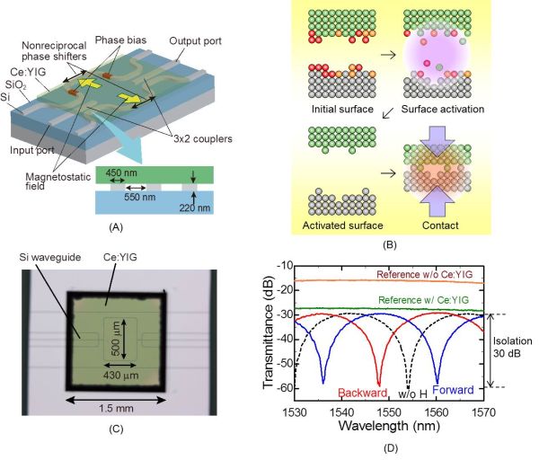 The authors, Yuya Shoji and Tetsuya Mizumoto, Tokyo Institute of Technology, approached the problem using a direct bonding technique which realizes direct contact of different materials. The authors have demonstrated the first optical isolator on silicon waveguide platforms. In this paper published in Science and Technology of Advanced Materials, they describe the direct bonding, design of the waveguide isolator, and recent progress on a silicon isolator with an optical isolation of 30 dB and a four port optical circulator. In the paper, they also introduce approaches done by other research groups. Compared to the state-of-the-art deposition approach, the bonding technique is advantageous because a single-crystalline magneto-optical garnet having a large magneto-optical effect can be used.
