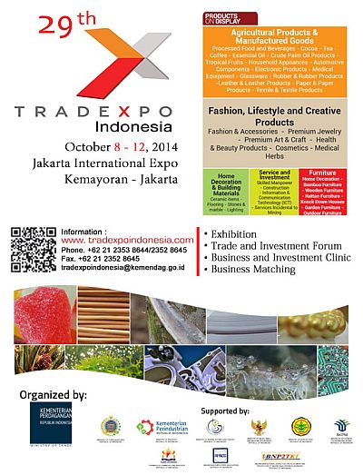 JAKARTA, INDONESIA, Aug 13, 2014 - (ACN Newswire) - The Ministry of Trade of The Republic of Indonesia will hold The 29th Trade Expo Indonesia (TEI), the largest international trade exhibition in Indonesia, on October 8-12, 2014 at Jakarta International Expo (JIExpo) with the theme "Towards Green Business". The theme reflects Ministry's objective to promote the potential and existence of products in Indonesia as high-quality and eco-friendly products, which are able to prop up the economy through the increase of non-oil exports value.