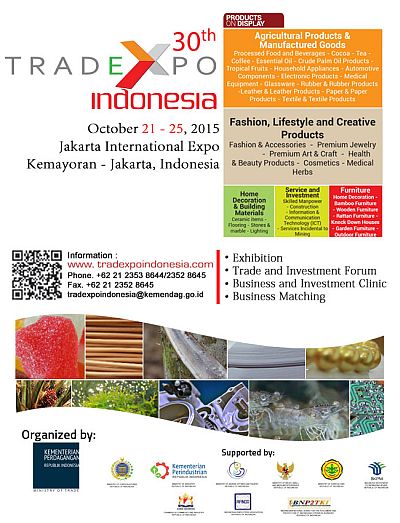 "TEI is our strategic promotional event to attract world markets towards Indonesia's leading products and services. This year the Ministry of Trade is targeting 2,000 exhibiting companies and 15,000 visitors, both domestic and foreign," asserted Pradnyawati. As an effort to increase the earnings at TEI, explained Pradnyawati, the Ministry of Trade will optimize the role of its Trade Attaches and Indonesian Trade Promotion Centers (ITPCs) in countries abroad by way of conducting intensive dissemination and approaches towards potential buyers so that they would attend the TEI 2015 event. TEI 2015 is scheduled to be held on 21-25 October 2015 at the Jakarta International Expo (JIExpo), Kemayoran, Jakarta. Within the 50,000 m2 exhibition area, there will be products and services that are divided into several zones, namely manufactured goods and services; furniture and furnishing; food, beverages, and agricultural products; premium fashion, lifestyle, and creative products; premium products from 34 Indonesia Provinces; and garden furniture.