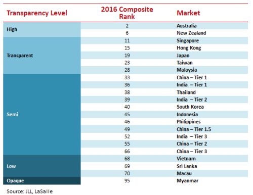 SINGAPORE, June 30, 2016 - (ACN Newswire) - Asia Pacific made the greatest progress globally in terms of real estate transparency over the past two years, according to JLL's Global Real Estate Transparency Index (GRETI) 2016. The index measures transparency by looking at factors including data availability, governance, transaction processes, and the regulatory and legal environment. Asia Pacific is a diverse region in terms of real estate transparency. Australia continues to hold the top spot as the region's most transparent real estate market, and together with New Zealand, is classified as 'Highly Transparent'.