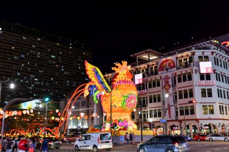 Designed in collaboration with 14 first and second-year students from SUTD, the Street Light-Up illustrates the life of the Rooster as it grows from a tiny hatchling to a mighty creature. Along the way, it learns important life values in different stages of its life, which is depicted through various lantern set pieces placed on the centre divider between New Bridge Road and Eu Tong Sen Street. This culminates in the centerpiece, a majestic giant Rooster lantern measuring 13 metres in height, perching proudly at the junction of Eu Tong Sen Street and Upper Cross Street.