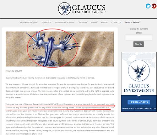 In the case of Glaucus Research, it is a professional organisation that specialises in short selling reporting. The logo of the company is a 'blue dragon', which is a small but strong marine creature that looks like a mutated lizard. Back to what's at hand, under its terms of service, it states that users 'agree that use of Glaucus Research California LLC's ("Glaucus") research is at your own risk. In no event will you hold Glaucus or any affiliated party liable for any direct or indirect trading losses caused by any information on this site.'