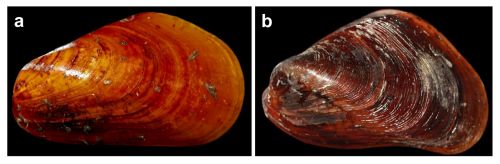 | | (Left) Shell of the deep-sea mussel Bathymodiolus platifrons and (right) shallow-water mussel Modiolus philippinarum. |