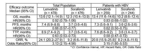 TOKYO, Sept 19, 2017 - (JCN Newswire) - Eisai Co., Ltd. has announced that the results of a subpopulation analysis of patients with hepatitis B virus (HBV) coinfection in a Phase III trial (REFLECT / Study 304) of its in-house discovered and developed anticancer agent lenvatinib mesylate (product names: Lenvima / Kisplyx, "lenvatinib") versus sorafenib as a first-line treatment for unresectable HCC were presented for the first time during the 11th Annual Conference of the International Liver Cancer Association (ILCA) held in Seoul, South Korea. In the total population analysis of this study, the treatment effect of lenvatinib for all patients on the primary endpoint of Overall Survival (OS) was demonstrated by statistical confirmation of non-inferiority to sorafenib. Lenvatinib showed highly statistically significant and clinically meaningful improvements in the secondary endpoints of Progression Free Survival (PFS), Time To Progression (TTP), and Objective Response Rate (ORR). The analysis results presented at ILCA indicate that in comparison to the total population, lenvatinib demonstrated a lower hazard ratio for OS, FPS, and TTP, and a higher odds ratio for ORR in the subpopulation of patients with HBV (See table below). HBV is considered to be a negative predictor of tumor response to existing drug therapies, so lenvatinib, which demonstrated a therapeutic effect in patients with HBV, is expected to be a new treatment option for patients with HCC.