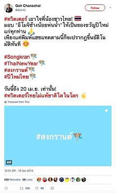 BANGKOK, Apr 11, 2018 - (Media OutReach) - As Thais and people around the world gather to celebrate the Songkran Water Festival, Twitter joins in the festive occasion by launching the first-ever #Songkran emoji. People can Tweet with the #Songkran emoji using both English and Thai hashtags. The #Songkran emoji is available from now until 20 April, 2018.