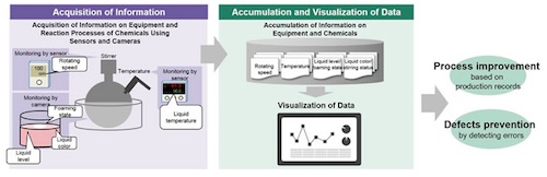 In recent years, given the diversification of customers' needs, rapid progress of digitalization, and intensifying global competition, there is a need for hi-mix low-volume production that meet customers' individual needs. In small-scale chemical production processes are difficult to be sensed using general instrumentation devices(1), quality is controlled by monitoring the production status with visual checks by workers at designated points. However, as the quality of finished products can vary even under the same manufacturing conditions-such as liquid amount and time-quality control requires considering factors that can be seen in liquid foaming state, color change, and other reaction states while the liquid is stirred, so as to improve the consistency of quality. Another issue, however, is that the frequency with which manufacturing processes can be monitored is restrained by the need to maintain productivity.