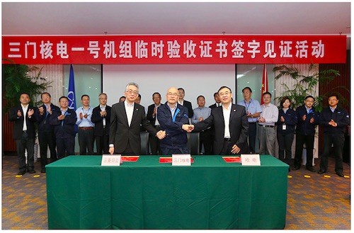 YOKOHAMA, Japan, Oct 12, 2018 - (JCN Newswire) - Mitsubishi Hitachi Power Systems, Ltd. (MHPS) announces that the steam turbine generation facilities supplied for the Sanmen nuclear power plant in China have cleared all necessary functional, safety confirmation, and performance tests, with a signing ceremony held on October 11. The turbine generators being used at the nuclear power station are MHPS' mainstay model with a 54-inch last stage blade. These systems have a proven track record at power generation facilities in Japan, and are now being used in full-fledged operations in China for the first time. The Sanmen Nuclear Power Station is the world's first commercial 3rd Generation 1,250 megawatt class pressurized water reactor (AP1000).