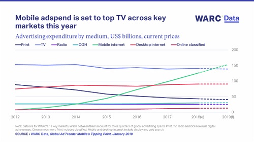 LONDON, Jan 24, 2019 - (ACN Newswire) - Data from WARC's 12 key markets -- Australia, Brazil, Canada, China, France, Germany, India, Italy, Japan, Russia, UK, US -- which between them account for three-quarters of global adspend, and 91.1% of all mobile adspend ($125.6bn), show that mobile is currently the second-largest ad medium, and will overtake TV this year if current growth rates are maintained. Eighty percent of mobile ad market value has been created in the last five years, and the rapid increase in advertiser investment has been driven by a sharp rise in daily mobile internet consumption, driven by social and media platforms.
