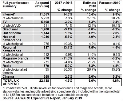 Overall market growth is being driven by increasing spend on online advertising, which is expected to grow 9.8% this year, following on from an estimated 13.4% rise in 2018. In the individual formats, the positive story for digital was reflected across the board. Notably high growth was recorded for digital radio ad formats, with a year-on-year rise in Q3 of +25.1%, and in VoD TV at +11.5%. Regional digital newsbrands witnessed growth of +10.9%, with national digital newsbrands measuring +3.7% growth, and digital magazine brands +1.5%. Stephen Woodford, Chief Executive at the Advertising Association said: "UK advertising continues to perform strongly, now delivering its twenty-first straight quarter of growth and demonstrating the commitment of British advertisers to investing in the growth and success of their businesses" "As the clock ticks down to our departure from the EU, it is crucial the Government provides the certainty we are all seeking in business. We are predicting continued adspend growth of 4.6% in 2019 and an agreement with the EU that keeps disruption at a minimum and keeps trade and talent flowing will greatly help this growth. UK advertising is the best in the world and we need a deal that ensures we keep it that way." James McDonald, Data Editor at WARC commented: "Our projection of 4.6% growth in the UK's ad market this year is firmly based on a business-favourable outcome from the EU withdrawal agreement, and would mark a decade of continuous expansion since the last advertising recession. "Further, a preliminary estimate of 6% growth in advertising investment last year represents a faster rate of expansion than was recorded in 2017, and is therefore indicative of an industry in rude heath. This is particularly true in relation to digital ad formats, all of which are currently forecast to attract higher levels of investment in 2019."