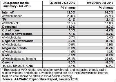 LONDON, Jan 28, 2019 - (ACN Newswire) - UK adspend rose 5.1% year-on-year to reach GBP5.6bn in Q3 2018, marking the 21st consecutive quarter of market growth and the industry's strongest third quarter of the year since 2015. This record investment highlighted in today's Advertising Association/WARC Expenditure Report underpins the preliminary estimate for 2018 adspend of GBP23.5bn - meaning the industry will have grown +6.0% year-on-year. The positive figures come ahead of the Advertising Association's LEAD summit on Wednesday (January 30th), which will look at the key themes of Trust, Trade & Transformation in the UK's advertising industry. Predictions of 4.6% growth for UK advertising in 2019 come amid calls from the industry for a positive deal for business from Brexit negotiations with minimal disruption. Key headlines from the report show: