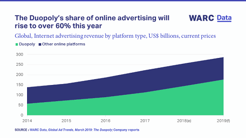 - For the first time, the strength of the duopoly is reducing the pool of ad money available to other online media owners - WARC Global Advertising Trends - The Duopoly |