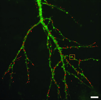 | | Neuron Imaging: Quantum dots can be attached to selected proteins. Imaging their emission in real time (red traces in this snapshot) allows to study the diffusion of proteins inside brain neurons. Scale bar: 5 microns. Credit: Modi, S. et al. Nanoscale 2018, 10/CC-BY |