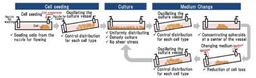 Expanding the market of regenerative medicine to recover the functions of tissues and organs is expected in recent years. A large number of cells are required for regenerative medicine but it is difficult to manufacture an enough amount of cells manually. So the automation technology of mass cell culture is necessary to expand the market of regenerative medicine.