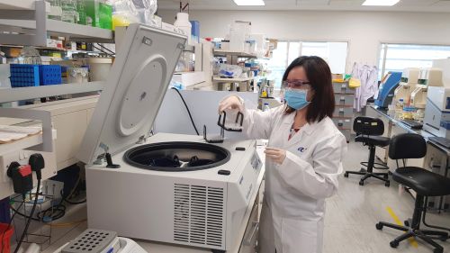 | | Scientists from the Experimental Drug Development Centre, A*STAR, using centrifuges to bring ETC-159 clinical sample reactions down. (Photo credit: A*STAR) |