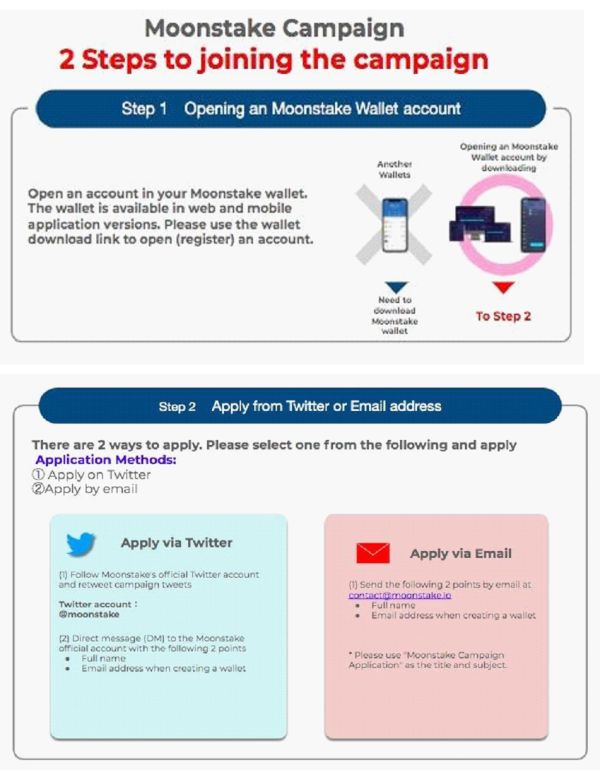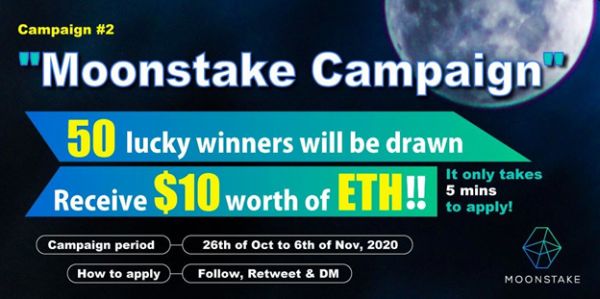 - Campaign Period: 26th of Oct to 6th of Nov, 2020. - Prize: 50 people will be given an ETH worth $10. Winners will be selected after the campaign period. - How to Announce of Winners: Winners will be notified by the method of how you applied (Via Twitter or Email). At that time, we will confirm the address for receiving ETH (it will be the ETH address of your Moonstake wallet).