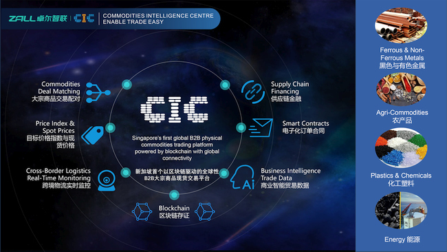 The Commodities Intelligence Centre (CIC) is a global trading platform for physical commodities including Ferrous & Non-Ferrous Metals, Chemicals & Plastics, Oil & Petroleum, and Agri Commodities. Launched in Singapore on 12 Oct 2018, CIC is a JV of China-based ZALL Smart Commerce Group, Global eTrade Services (GeTS) and Singapore Exchange (SGX) to build trade connectivity through digital marketplaces and to grow a vibrant trading ecosystem in Singapore.