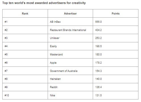 LONDON, Mar 16, 2022 - (ACN Newswire) - WARC Rankings - Creative 100, the ultimate independent global benchmark for marketing celebrating creative excellence, is now released featuring the most awarded campaigns and companies in the world. The top ten most highly ranked campaigns and companies in the 2022 WARC Creative 100 are: Compiled by WARC, the international marketing insights company, the Creative 100 (www.warc.com/rankings/creative-100) Ranking is produced by combining the results of the industry's most important global and regional creative award shows tracked throughout 2021. The awards tracked are determined by a worldwide industry survey and in consultation with the WARC Rankings Advisory Board (www.warc.com/rankings/about).