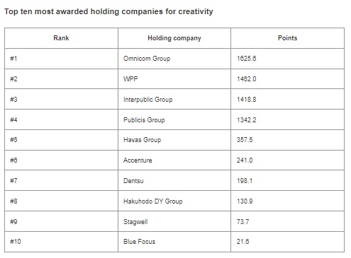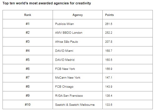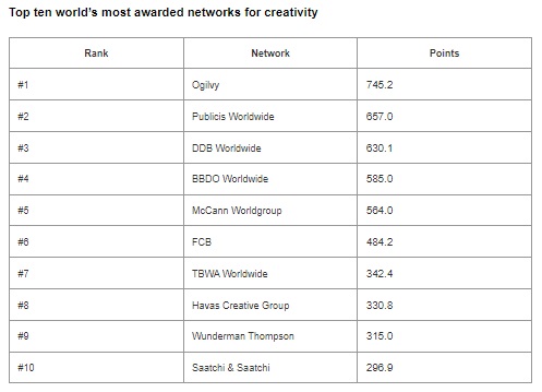 Retaining its top spot for a second consecutive year is Ogilvy, with four agencies in the top 50 contributing points to its total, including DAVID Miami and DAVID Madrid both ranked in the top five. Publicis Worldwide and DDB Worldwide follow in second and third place respectively.