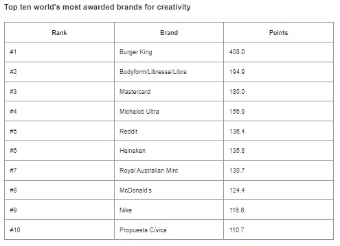 Fast-food chain Burger King is top creative brand for the fourth consecutive year, with six campaigns ranked in the top Creative 100 for four markets - Mexico, Spain, UK and USA. Bodyform/Libresse/Libra follows in second place, and Mastercard is in third, up from #25 last year.