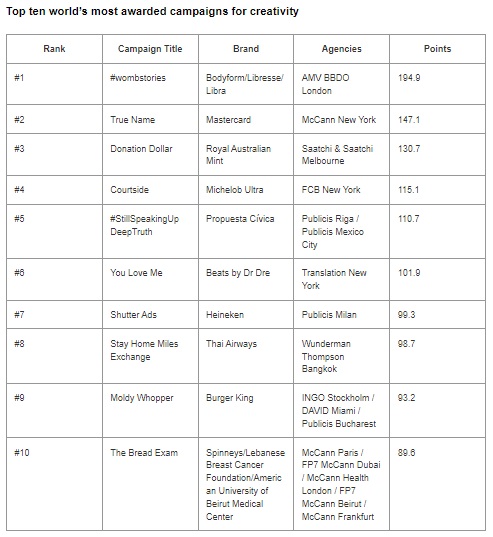 | Ranked #1: Campaign: #wombstories | Agency: Publicis Milan | Network: Ogilvy | Holding Company: Omnicom Group | Brand: Burger King | Advertiser: AB InBev | Country: USA |