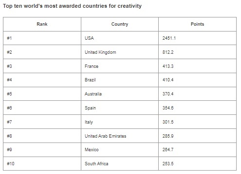 USA retains its place as the most creatively awarded market in the world by far. The UK remains second, and France moves up to claim third place.