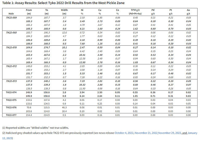 Table 1: Assay Results: Select Tyko 2022 Drill Results from the West Pickle Zone https://www.acnnewswire.com/docs/Multimedia/Low_Table202302061.jpg