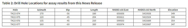 Highlights - West Pickle mineralized strike length increased to over 600 meters, remains open to the east and west. - New West Pickle Zone assay results include: -- 3.9% Ni, 2.5% Cu, 0.05% Co, 0.55 g/t Total Precious Metals ("TPM") (Pt+Pd+Au) over 2.0 meters of massive and semi-massive sulphides in hole TK-22-074 -- Including 8.1% Ni, 2.8% Cu, 0.11% Co, 1.05 g/t TPM over 0.9 meters - Property Wide Feeder Dyke / Chonolith geological model -- Successful first test returns wide interval of anomalous nickel, supports exploration thesis that east-west trending interpreted feeder dykes are mineralized (Hole TK22-076, located 2 kilometers West of the West Pickle Zone) -- RJ Zone, 2.7 kilometres east of West Pickle, previously retuned 85.4 meters of ultramafic hosted mineralization with Feeder Dyke / Chonolith breccia textures: ---- 0.5% Ni and 0.2% Cu over 85.4 meters in hole TK-16-002 ---- Including 1.0% Ni and 0.2% Cu over 16.2 meters (see press release June 8, 2016)