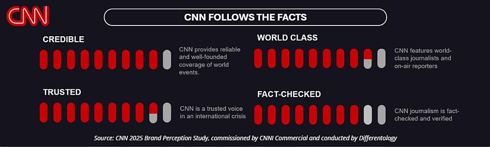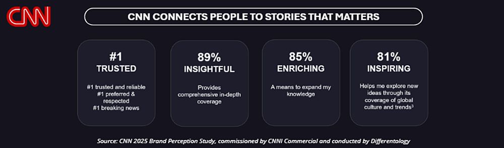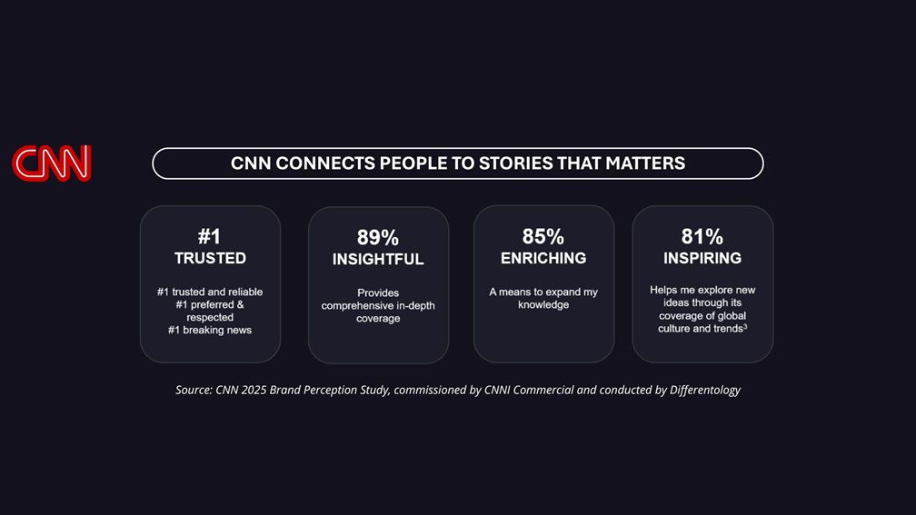 ニュースメディア全般への信頼が40%にとどまるメディア環境において、CNNは信頼性、正確性、速報性の各分野で第1位の評価を得ており、複雑化する世界を読み解く上で、視聴者を導く不可欠な存在となっています。また、国際的な出来事を包括的かつ検証に基づいた内容で報道することで、視聴者に確かな情報を提供し、安心感をもたらすとともに、意思決定を支援する欠かせない指針としての地位を確立しています。