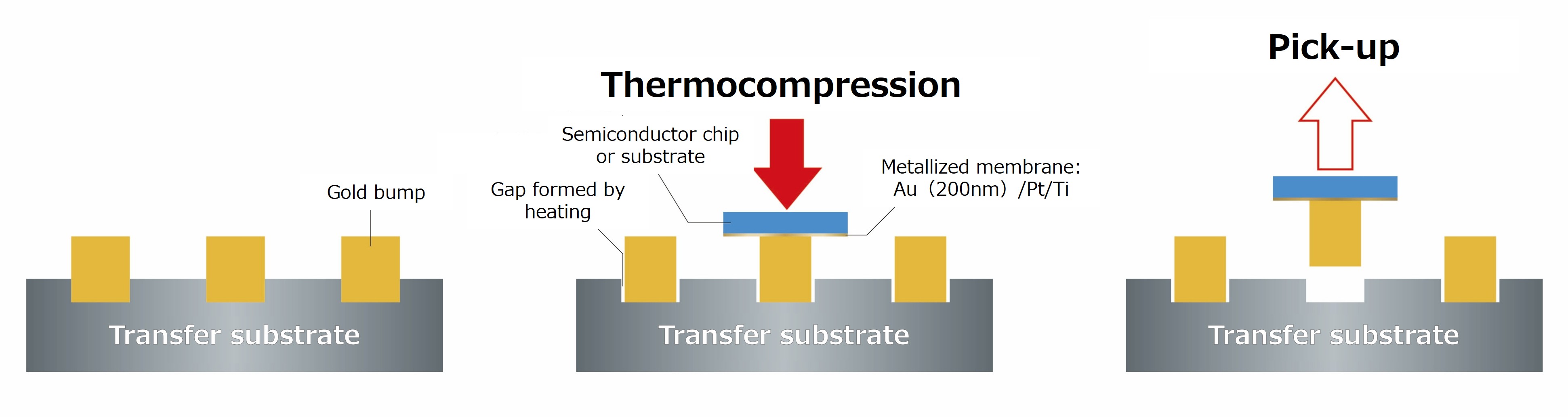 In this technology, at first, gold bumps are formed on a substrate (transfer substrate). Then, the gold bumps are transferred to the target semiconductor chip or substrate. Openings are created on the silicon substrate used as the transfer substrate, and gold bumps are formed in them. By filling the entire opening, the gold bump is held by the substrate, eliminating the risk of dropping during the process. Meanwhile, during transfer, the gold bump shrinks under heat-treatment, forming a tiny gap between the opening and the gold bump. This allows easy extraction of gold bumps by the application of a force in the vertical direction.
