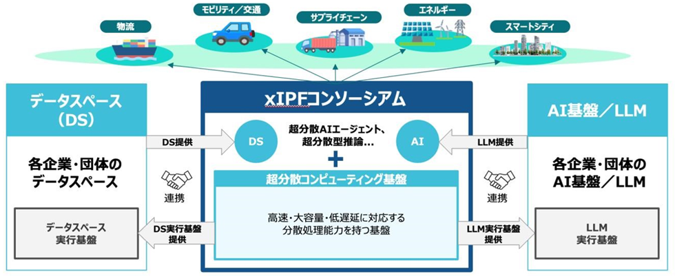 「xIPFコンソーシアム」は、超分散コンピューティング基盤と、企業や団体が持つAI基盤やLLM(大規模言語モデル)や、データスペース(注2)を連携させて、分散した環境下のAIとデータを安全かつ柔軟に連携させて活用できる社会基盤(AIスペース)の実現をめざします。これにより、日本の産業や社会が抱えるさまざまな課題の解決を後押しして、物流やモビリティ、エネルギー、まちづくりなどの幅広い分野でAIを活用した新たなサービスや価値の創出を推進します。また、取り組みの推進に当たり、産業界が主体となって行政・学術機関と連携し、異業種間のデータ連携を促進するとともに、国際的な動向を踏まえながら、日本発の先進的なモデルを国内外へ発信していきます。