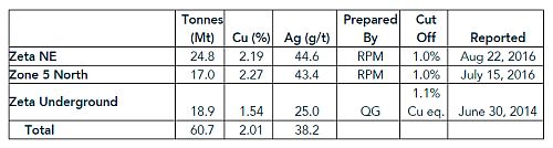 In the second half of 2016, four additional diamond core holes totaling 4,063 meters were drilled at depth at Zone 5 North and two additional diamond core holes totaling 1,669 meters were drilled deep at Zeta NE. All of these holes intersected mineralization below the current Inferred Mineral Resources and confirm continuous high-grade copper mineralization to depths greater than 1,000 meters below surface at both Zeta NE and Zone 5 North. The results from these holes are in addition to the mineral resource estimates reported above and have the potential to increase both the tonnage and grade of the mineral resource estimates at both Zeta NE and Zone 5 North. The mineral resource estimates will be updated in the second quarter of 2017 to include these latest drill results.